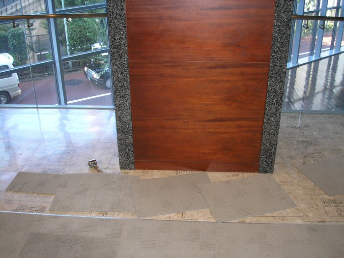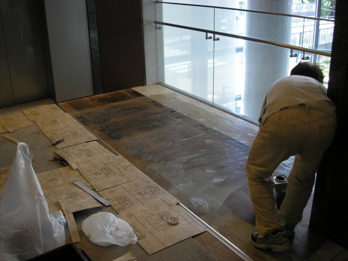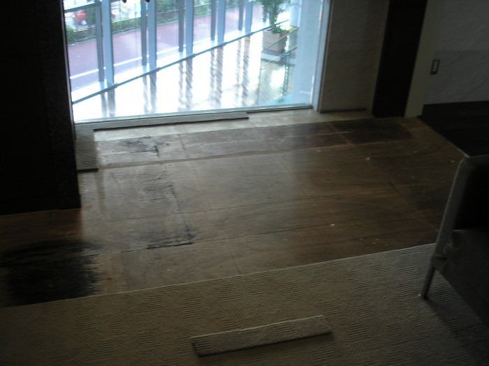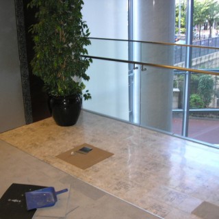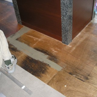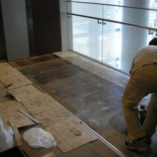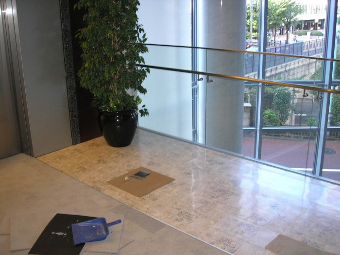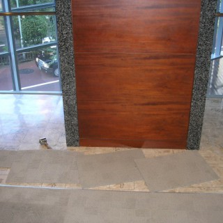 こちらは、不特定多数の方が訪れる施設ビル。ビルを管理している会社様からのご依頼でタバコの焦げが気になるというので何とかならないかとのご相談。高級感のあるタイルカーペットが敷き詰められております。その雰囲気を大事にして改修する。これに適用できる素材をメーカーと確認し選定。張り替えを実施。