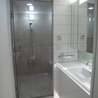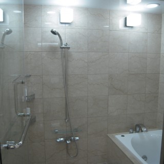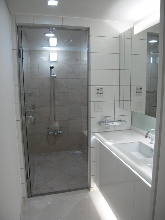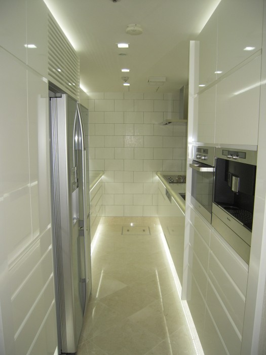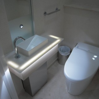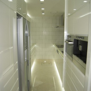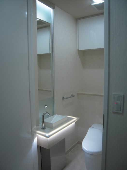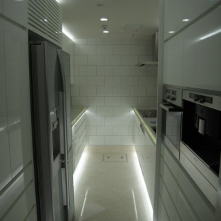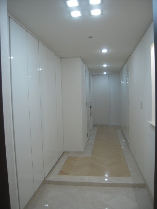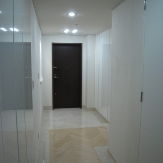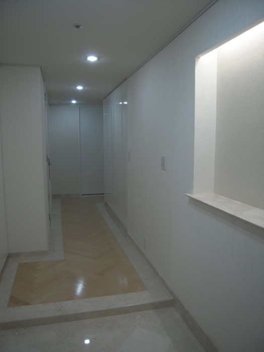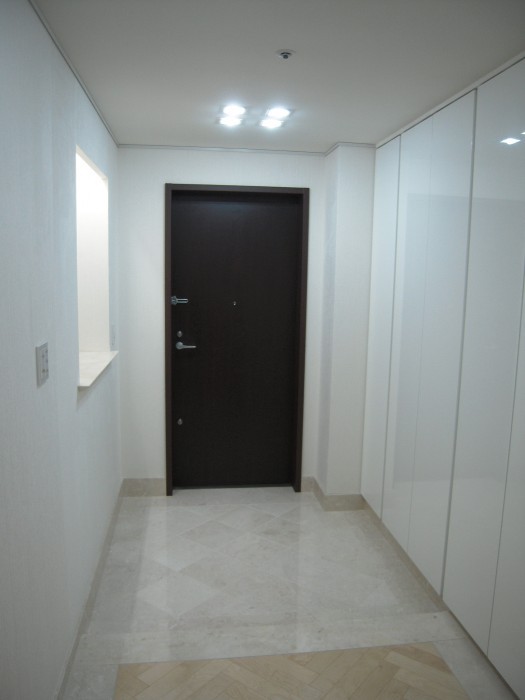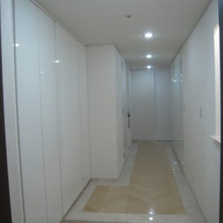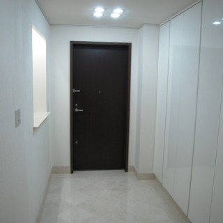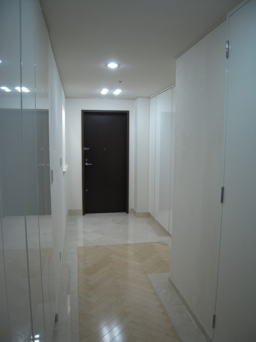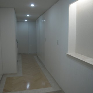 オンリーワンのハイセンスなラグジュアリー空間をめざし、間取り変更、設備機器の総入れ替えを実施、ハイグレード仕様で設計を進めていきます。まず、まぶしいくらいの明るさを実現とする内装コーディネート。主要な仕上げですが、玄関から大理石石張り、廊下床は、大理石ボーダーに白木フローリング へリンボーン、収納建具、各室内建具はピアノ塗装、各室は、天井折り上げの間接照明、キッチンは、床大理石張りから壁タイル、キッチンカウンター、面材もまぶしいくらいです。ユニットバスは当時最高級のINAXのスートルームで交換、もちろん洗面・トイレもカッコよく仕上がりました。