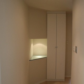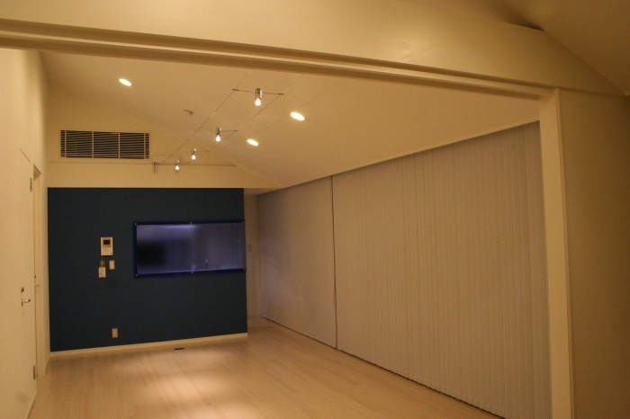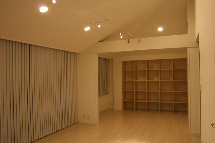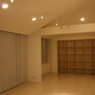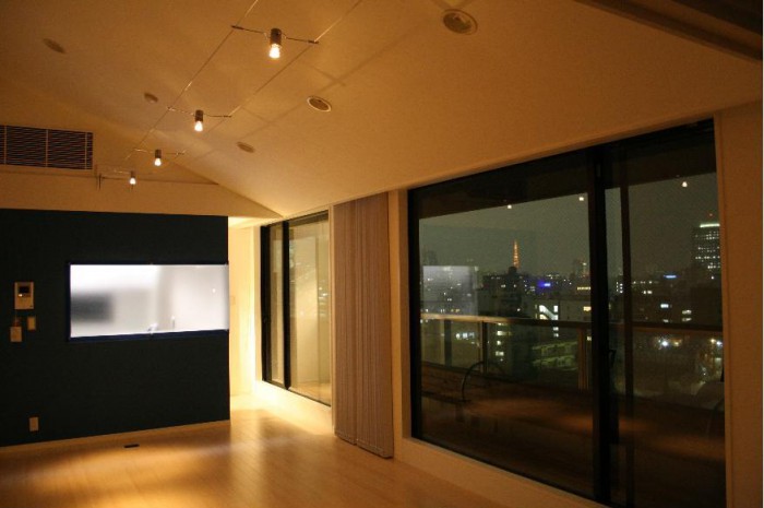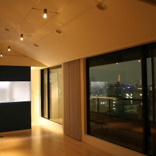 天井が高く開放感がある空間をさらに広く見せる為、壁の色は白に統一、フローリングはナチュラルカラーを採用し、広がりを出しました。また、この部屋の最大の特徴は、ビルの7階から渋谷~六本木までを望む抜群の眺望なのですが、照明の工夫によりガラス面への映り込みを減らし、素晴しい夜景を堪能できるお部屋にしました。