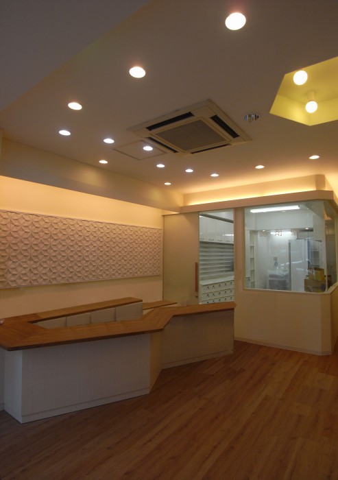 調剤薬局のプランニング。施工はちょっと前ですが、この案件は、設計業務だけを請けました。弊社の担当設計士が現地に足を運び、施主とのヒアリングを実施して線を描いていきました。調剤薬局へ訪れる人々の心理を考え、癒されるものでなければいけない。空間の優しさ、光のぬくもりを表現しております。ただただ事務的に行うだけでなく。患者の目線にたったもの押し付けでないデザインを目指しました。