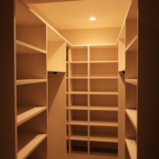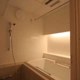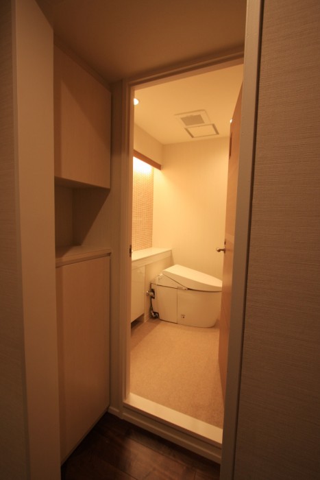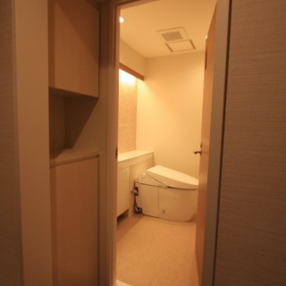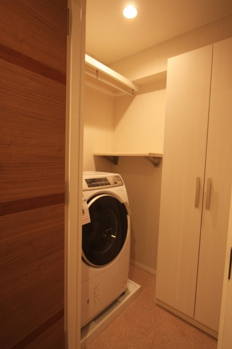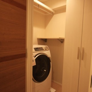 洗濯機置き場;白を基調に明るく、また収納を十分設けた。