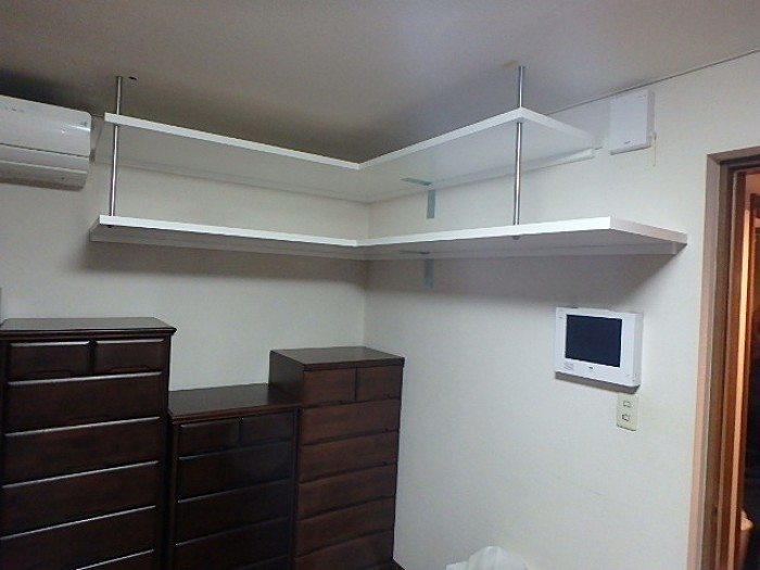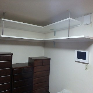 いつもご依頼を頂きますお客様から。ある洋室のクローゼットを便利な勝手の良いものに変え、かつ収納力UPで棚を増設しともかく無駄なく収納したいとのご要望です。折れ戸を撤去しオープンに。ともかく機能重視に。