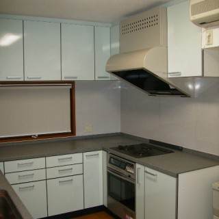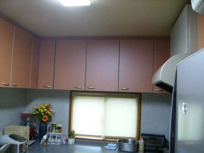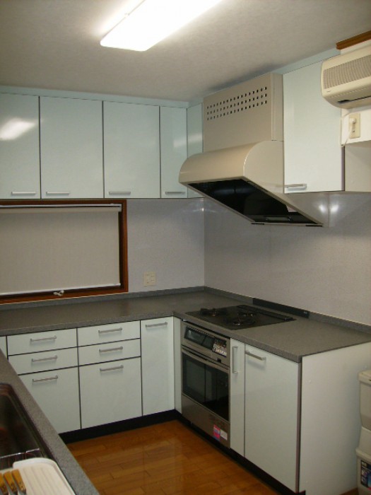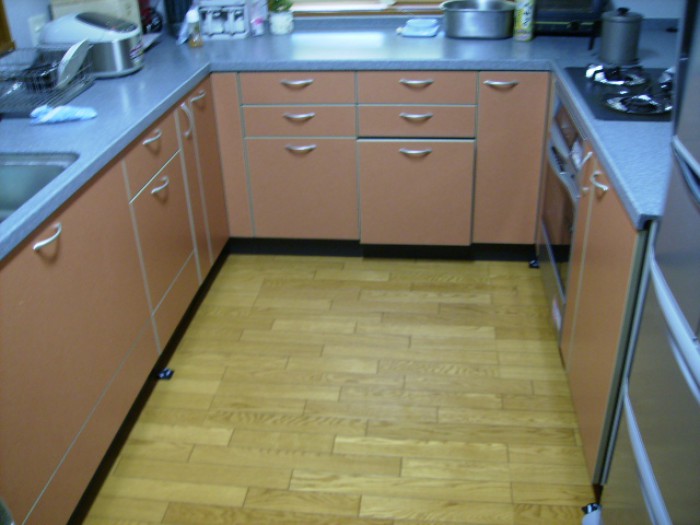 こちらは大型キッチンのリニューアルです。それぞれの好みが出るが、でも遊べる部分がこのキッチンなどですね。この個性的な色を優しいミントグリーンに ※施工前