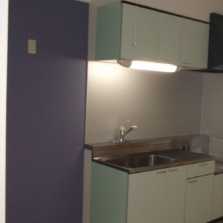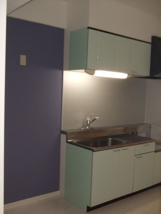 キッチン扉をミントグリーンに冷蔵庫置き場の壁をパープルに。色で遊び心を演出。差別化をはかり、内覧者にインパクトを与える。