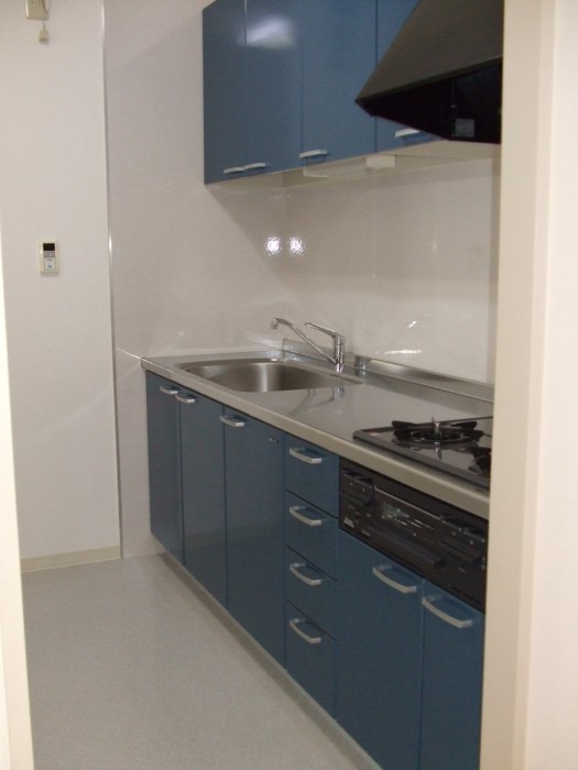 こちらは、ファミリー向けのキッチン。いろいろテーマをもって部屋ごとに色を変えていく。既存の物件のリフォーム。もとは、お決まりのアイボリー色でした。ここは濃いブルーで。