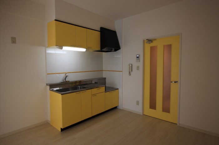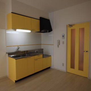 女性向けのマンション。入口建具とキッチン扉を黄色に合わせて。またキッチン壁にビビットなオレンジをアクセントに。オーナー様の意向のデザイン。もちろん、即、決まりました。