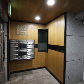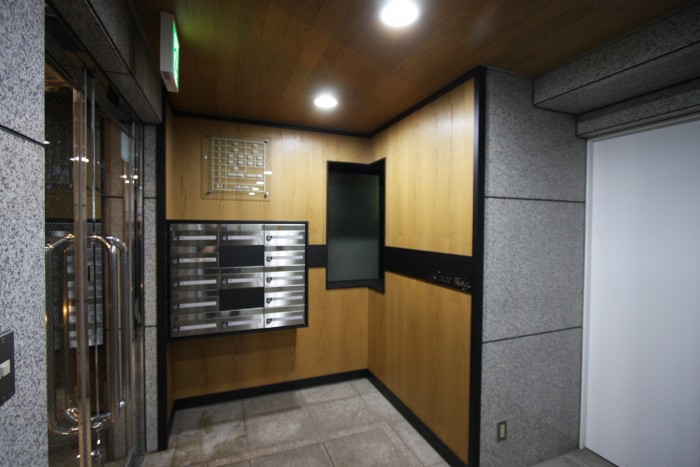 壁面アクセントとして木板張り(不燃)、集合ポストなどを更新。天井も落ち着いた空間を演出するために木板張りとした。