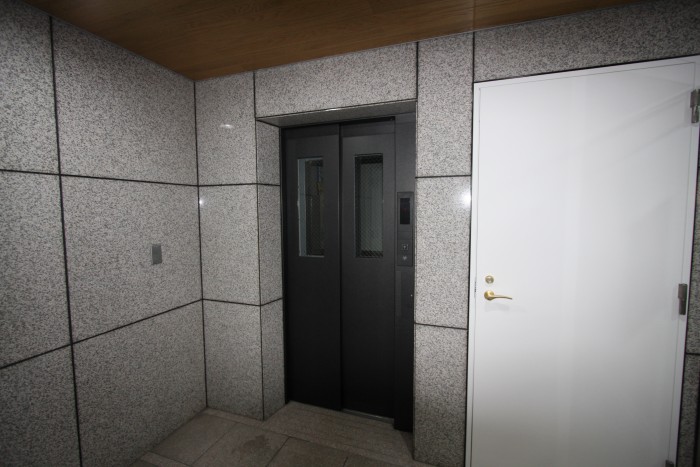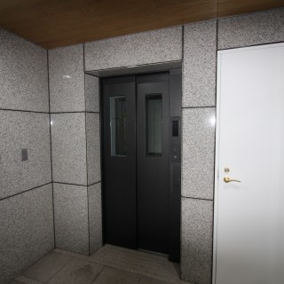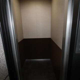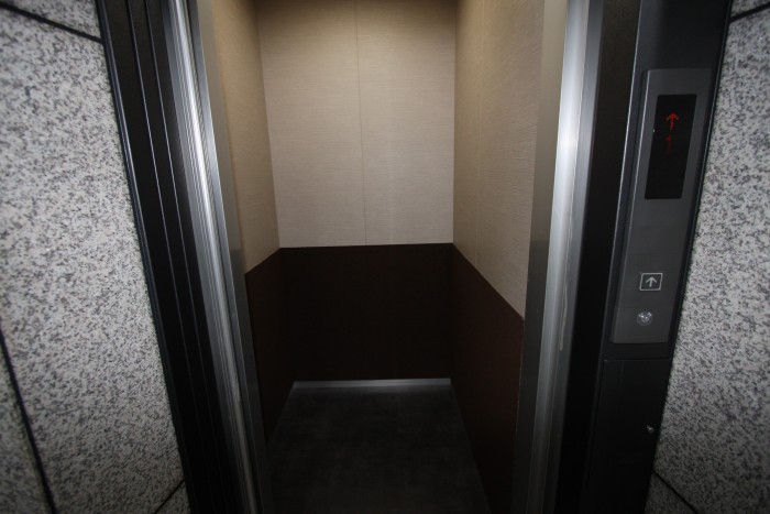 エレベーターの意匠リニューアル。高級感を演出する為に、赤色のドア外側をブラック系のダイノックシート張り。