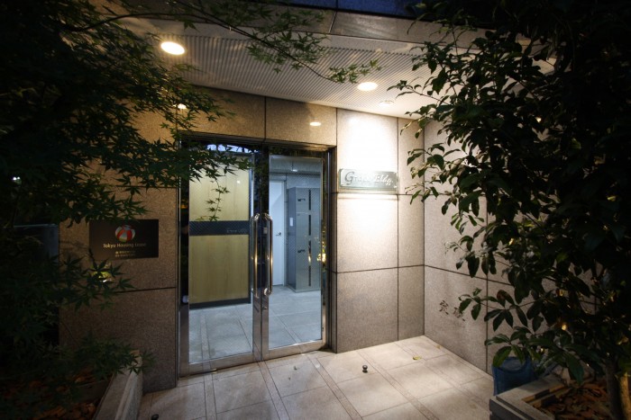 夜間のエントランス。アプローチから。