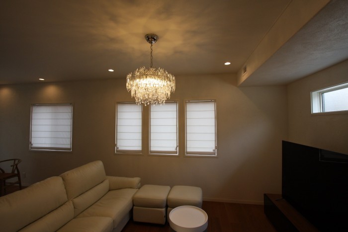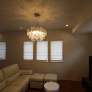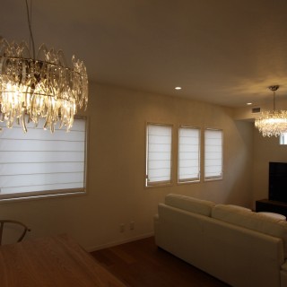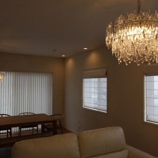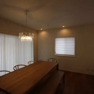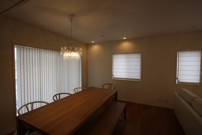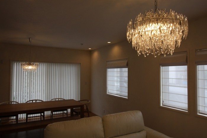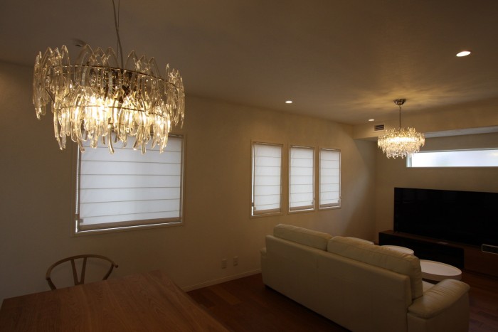 一般戸建ての家具及び照明のコーディネート。照明はシャンデリアでシンプルなもの。家具と床は無垢のアメリカンチェリー。