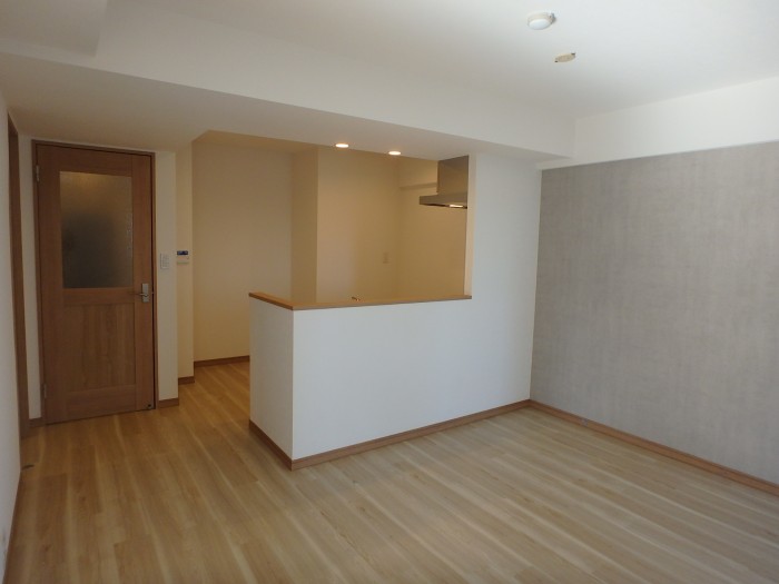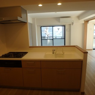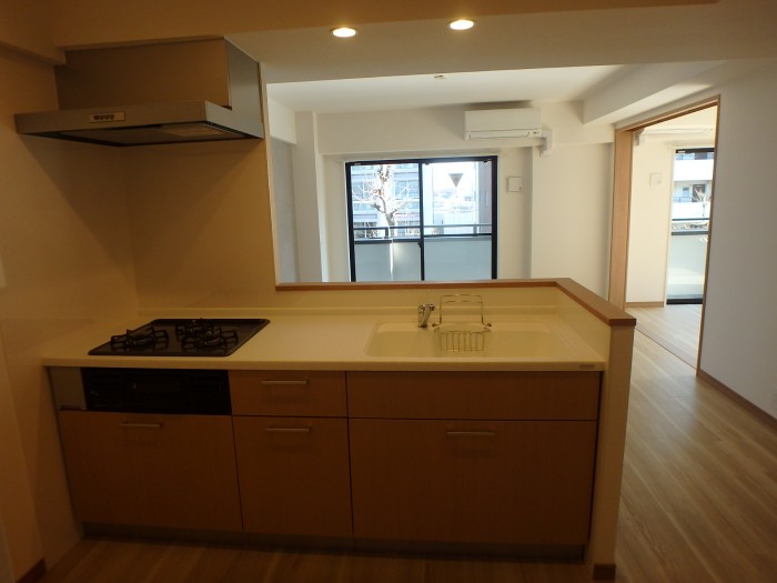 対面型キッチン。壁付I型キッチンを設置。ナチュラルなカラーコーディネートでファミリー向けのマンション。